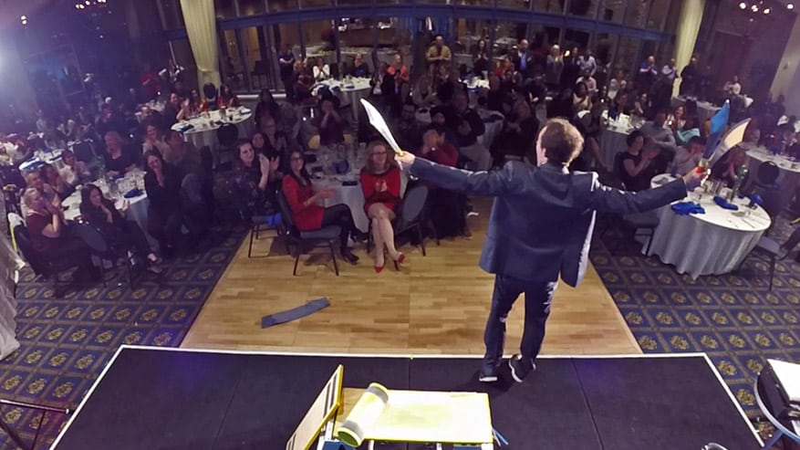 Whether guests were strapping Sam into a straitjacket or helping him climb on a makeshift see-saw to juggle knives, he made sure they were comfortable on stage. Although he injects a lot of humour into the show, Sam keeps it completely clean throughout. He never says anything that would offend or embarrass anyone. Instead, his act is clean, classy, and designed to delight people from all walks of life.