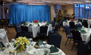 Four hours before guests arrived, Sam and his technician set up theatrical lighting, bright clue stage curtains, and a crystal-clear sound system. By the time guests walked in the doors, the two-person team had the venue’s Bank of Montreal room transformed into a dinner theatre.