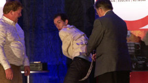 Guests really started laughing when audience volunteers, executives, and VIPs were invited on stage to join in the fun. Once in the spotlight, these volunteers quickly became the real stars of the show. They locked Sam in handcuffs, assisted him while juggling knives, and even strapped him into a straitjacket during a tribute to Houdini. Together with Sam, the guests at Firecon created memories that will last a lifetime.