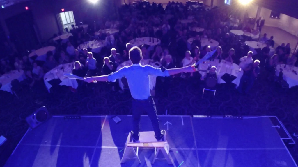 The morning of the gala, Sam and his technician flew from Toronto to Thunder Bay with his bag(s) of tricks. Arriving well in advance allowed Sam and his technician several hours to work with the on-site AV team, ensuring every single detail was perfect before the show began.