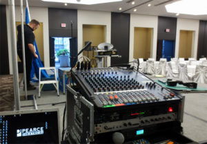 Along with making sure guests were entertained and engaged, Sam’s team also took care of the audio-visual requirements for the event. Four hours before guests arrived, Sam’s team set-up theatrical lighting, a crystal-clear sound system, and bright blue stage curtains; everything needed to transform the Hilton’s ballroom into a dinner theatre. They even set-up an additional sound system in the Hilton’s foyer to play instrumental jazz music while guests enjoyed cocktails.