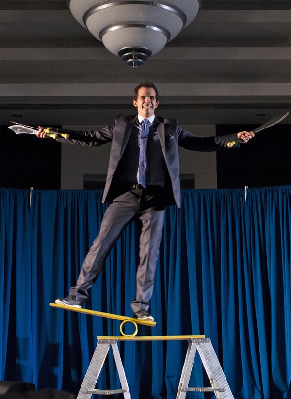 One of the highlights was when MHS’s CEO was invited on stage to take part in the big finale. Before he realized it, he was helping Sam climb on top of a makeshift see-saw to juggle giant knives! It was a hilarious moment that’s sure to be remembered for many years to come.