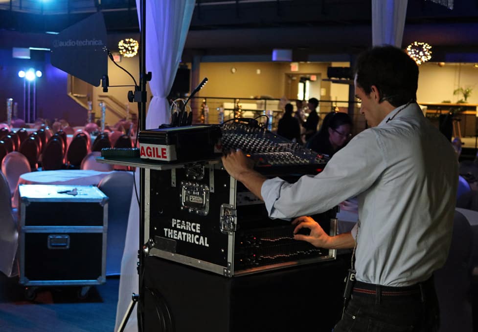 While the decorators added pizzazz to the room, Sam and his technician were focused on the stage. The magician’s team set-up theatrical lighting, a crystal-clear sound system, and bright-blue stage curtains. They supplied and set-up all the equipment needed to ensure each and every guest could easily see and hear the after-dinner performance.