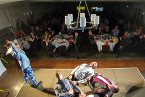 Four hours before the party began, Sam and a theatrical technician arrived at the Elm Hurst Inn to prepare for the show. After unloading equipment from their truck, they unpacked everything needed for the evening’s performance. If it’s needed, Sam owns it – Alexandra Hospital didn’t have to rent anything from an off-site AV company to make the show happen. Sam’s team provided all the equipment and expertise for a fun and flawless night of entertainment.